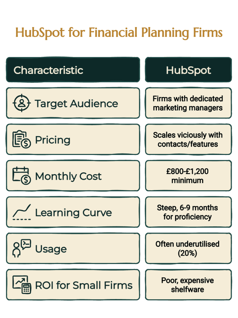 I worked with a Kent-based adviser last year who spent £14,000 on HubSpot in his first year. When we audited his usage, he’d sent exactly 11 email campaigns and had three active workflows. The ROI simply wasn’t there for a practice his size.