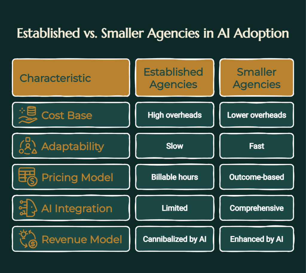 The widening efficiency gap means established agencies continue operating with production models that made sense a decade ago but create an impossible cost structure today. When your competitor can deliver equivalent quality in one-fifth the time, the only sustainable responses are radical restructuring or doubling down on premium positioning.